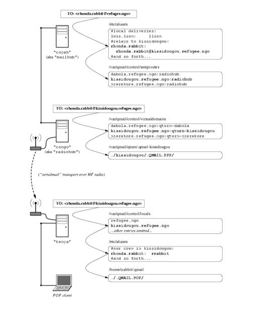 To show how this can be done with qmail, let's first consider a message arriving (or originating) in Conakry for rhonda.rabbit@refugee.ngo, a user who happens to be posted to the field in Kissidougou. The key processing steps are sketched in Figure 2 and described in more detail below.