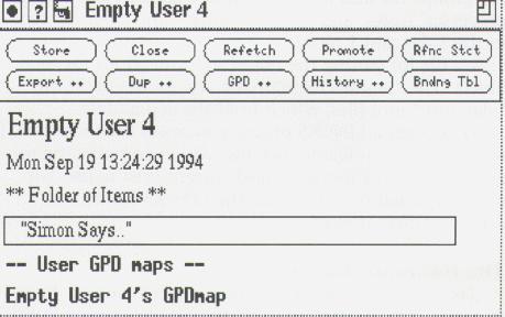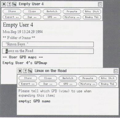 Now we'll start writing our upcoming article for Linux Journal about “Linux on the Road”. We prefer to store the article in our home directory (the “Empty User 4” window). First, move the cursor to the “Simon Says.” line in “Empty User 4” window. Then, insert a new item in folder view by giving the command meta-l meta-i (insert closest plural), which will create a sibling of the current item. (See “The xlincks User” manual or the next part of this series for more information.)