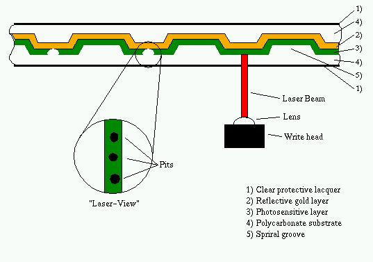 On the writable CD, the polycarbonate substrate, has a spiral groove that helps the laser stay on course during burning and playback. On that substrate a thin gold layer is laminated to provide the best possible reflection to a reading laser. Over the gold layer is a photosensitive dye layer, and over that is a clear protective lacquer. While you use a weak laser to read a CD, you need more power to write. The laser beam heats the photosensitive layer and creates a kind of hole that shows us the gold layer. When you read such a CD-Recordable, the holes in the photosensitive layer can be interpreted as “pits”, making it possible to read such a CD with all common CD-ROM and audio players. However, the “pits” are not as sharp as on a pressed CD and can cause troubles on a few older CD-ROM drives, which report occasional read errors, while others perform flawlessly.