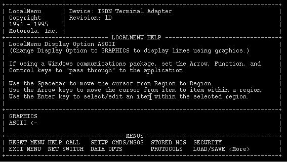 Now the fun part: configuring the Bitsurfr Pro. The Bitsurfr Pro requires a full VT100-compliant terminal emulator to use its local menu. During my testing, I have found only Seyon to work—Minicom did not work for me—run Seyon (i.e., seyon - modems/dev/cua1). Type AT to get the Bitsurfr's attention. Then type AT@MENU. The local menu will appear as shown in Figure 1.