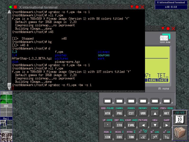 An included patched rxvt called xiterm allows pictures to be displayed in the background with Offix DnD compatibility (just like the Wharf). Select a file in xfm, drag it to xiterm, and its name will appear on the command line you're typing. It's lighter than xterm, supports color and will be more linked with AfterStep in version 1.3.2, becoming a standard part of its GUI, like title bars, Wharf and Pager. Configure-time options are made via menuconfig (just like the Linux kernel); this will also be true for future versions of AfterStep.