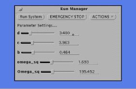 Assuming that the system file contains no syntactic errors, the program log window contains only progress messages, and a pop-up panel for controlling simulations appears (Figure 2). As long as only parameter changes are made, a series of simulation runs can be made. Plotting and printing is handled by gnuplot running as a child process.