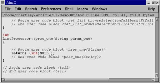 One thing we notice from the snapshot in Figure 12 are the “user code block” begin and end comments around the user code blocks. Anything between these can be modified by the programmer. BX reserves the right to make changes outside of these user code blocks, but will otherwise not interfere. BX avoids clobbering user-written code by scanning for and skipping over sections that are reserved by the developer. At the beginning of a project, these are empty lines bounded by the comment delimiters. Throughout the BX-generated code, these comment blocks will be found before, during and after any major code operation. This may seem superfluous to the new GUI programmer used to having only callback code stubs generated, but they can be a big help in tweaking final production code for major systems.