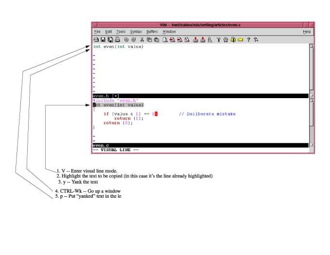 Now that you have a C file, you should create a header. It would be nice to be able to copy and paste the prototype from the C file into the header. With vi you couldn't do this. With Vim, it's easy.