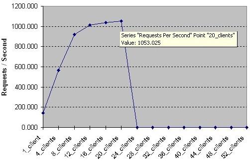 We suffered stability problems with the ZNYX Ethernet Linux drivers. The drivers were still under development; they were not production-level yet. After reaching a high number of transactions per second, the driver would simply crash. The following is a sample benchmark on one CPU running Apache 2.08a. Once the CPU reaches the level of servicing 1,053 requests per second (throughput of 6,044,916 bytes per second), the Ethernet driver would crash and we would lose connectivity to the ZNYX ports (see Figure 17).