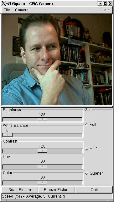 gqcam -v /dev/video0What you choose to observe with Gqcam is entirely up to you, but as to what you can do with the program itself, allow me a few suggestions. If you look at Figure 1, you'll see a shot of Gqcam in action. While it is running, you can do some interesting things. For instance, you can, at any time, click on the Snap Picture button to capture a frame. You'll be given the option of saving it in either PNG, PPM or JPEG format. If you were to click a number of images quickly, you could assemble them into a movie of sorts.