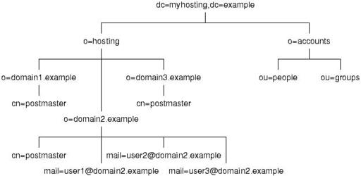 Figure 2 shows a sample directory tree for a web hosting company. The company's domain name, myhosting.example, was chosen as the root suffix. Postfix and Courier both search the o=hosting,dc=myhosting,dc=example subtree for e-mail information. The o=accounts,dc=myhosting,dc=example subtree shows how you could integrate shell account information for PAM into the same directory, but this is not necessary for setting up e-mail. Each hosted domain gets its own organization beneath the hosting organization. Each e-mail account goes under the domain's subtree. Thus, the distinguished name for the <user2@domain2.example> e-mail address is:
