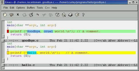 Figure 4. Diffing two files. Emacs shows not only which lines are changed, but what the changes are.