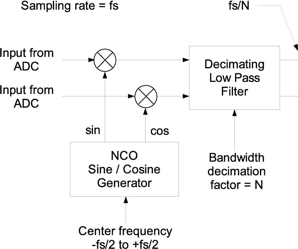 Using a good USB host controller, the USRP can sustain 32MB/sec across the USB. The USB is half-duplex. Based on your needs, you partition the 32MB/sec between the transmit and the receive directions. In the receive direction, the standard configuration allows you to select the part or parts of the digitized spectrum you're interested in, translate them to baseband and decimate as required. This is exactly equivalent to what's happening in the RF front end, only now we're doing it on digitized samples. The block of code that performs this function is called a digital down converter (Figure 3). One advantage of performing this function in the digital domain is we can change the center frequency instantaneously, which is handy for frequency hopping spread spectrum systems.