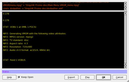 Watch carefully for any error flags printed in red. If you ignore them, you'll find yourself burning coasters, if you have a burnable image at all. If you do get any red flags, re-run the batch, clicking the Export rather than the OK button, which will export a shell script that you can disassemble and tweak to track down and correct your problem. This isn't often necessary, but every once in a while the program just doesn't generate the proper output and it has to be hand-tweaked.