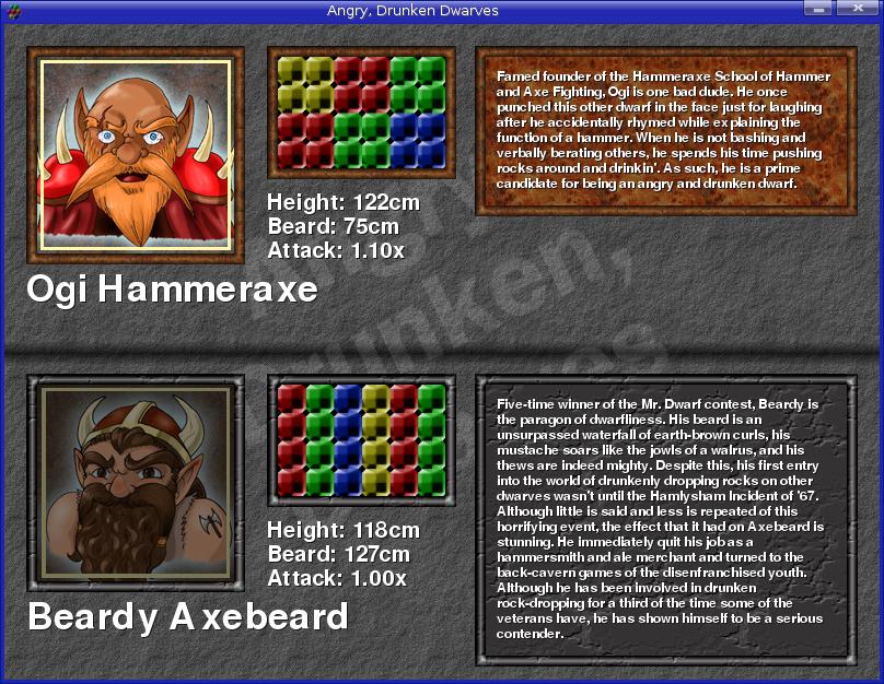 Now, I did say that this was a multiplayer game, which means playing against another flesh-and-blood opponent or a computer-generated one. At the beginning of the game, each player chooses a dwarf. To help you choose a player, Angry, Drunken, Dwarves presents you with pictures, names and bios of the dwarf contestants (Figure 4). Each dwarf also has an attack pattern, which you can use to your advantage if you are smart. During game play, your opponent's rules are the same, but whenever you break gems, your opponent drops counter gems on you, which means you have to work twice as hard and twice as fast in order to clear them. As turnabout is indeed fair play, your opponents get the same treatment when they break gems.