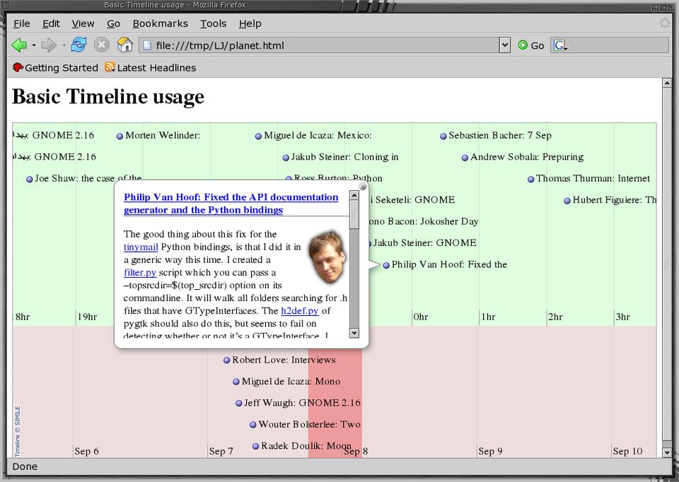 Individual Blogs and the Planet Blog aggregator normally offer RSS 1.0 feeds. The shell commands to show a Planet on a Timeline are shown in Listing 10. The planet GNOME RSS feed URL could have been included directly into the Jena SPARQL command. Keeping it separate allows you to archive your blogs or combine many blogs into a single RDF file for querying.
