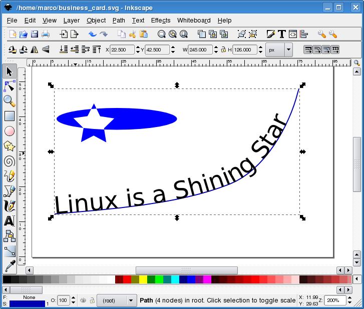 The big button with the capital A lets you create text objects. So far, this is nothing special. What is great though is the possibility to make text follow any line (Figure 7). Select both the text and the line while pressing the Shift key, then select Text→Put on Path in the top menu.