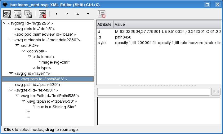 and lots of other very verbose, but plain ASCII text—terribly ugly but still editable by hand in an emergency or processable by a script. What if you have lots of logos and clip-art files, all with the names and official color of your company, and then either the name or the color changes? If all the files are in SVG, you simply can replace the right strings with awk, sed, Perl or any other scripting language. To do the same thing on one single file inside Inkscape, click on the <> bracket buttons or press Shift-Ctrl-X to launch the Inkscape XML editor. Figure 8 shows how the XML tree of the “Linux is a Shining Star” business card looks in this editor. Path # 3456 is the oval/star shape combo from Figure 7. With this editor, it is possible to change almost anything in the current file, including SVG features for which there are still no graphical tools. Another reason to use the editor is that every change you make in it immediately applies to the actual graphic in the main Inkscape window. Speaking of structured documents, selecting File→Document Metadata in Inkscape opens a pane where you can set the Dublin core entities or the license of the current file.