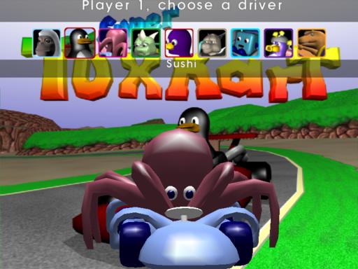 In honor of this momentous event, the first race game on tonight's menu, SuperTuxKart, features the very same Tux at the wheel. SuperTuxKart, maintained by Joerg Henrichs, is an updated and enhanced version of the original TuxKart, created by Steve Baker. If you've played the original, you'll be impressed by the new, hugely improved, SuperTuxKart. The game features slick new graphics, new tracks, cool characters, racing adventures and more. You take the controls as one of several characters, including Tux, Penny (his friend), Mr. Ice Block, Sushi the Octopus (Figure 2), Yeti and others. You can get SuperTuxKart from supertuxkart.berlios.de.