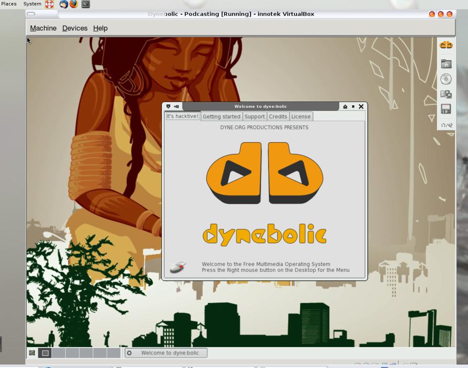My new group membership is all I need to launch my virtual machine successfully, and I am now running dyne:bolic in VirtualBox on my Ubuntu Gutsy machine (Figure 11). I have good reasons for wanting to run dyne:bolic in a virtual machine—primarily because dyne:bolic doesn't like my actual video card, an ATI x1400, but it has no problems with the innotek virtual VGA driver. I also get the added benefit of not having to boot my system in dyne:bolic, so I retain access to my host machine while I'm using it.