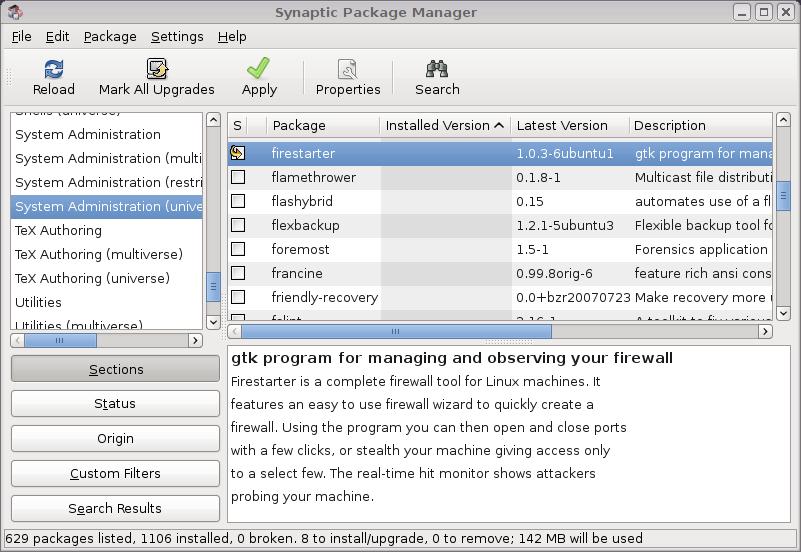 Personally, I prefer the Synaptic Package Manager (Figure 2). It handles dependencies more gracefully and offers more options for filtering and listing packages. It also lists raw packages (all the individual deb packages that make up an application), whereas the Add/Remove Applications applet lists packages only by application name (which isn't as precise). If installing an application involves four separate component packages plus seven dependencies, I want to know it.