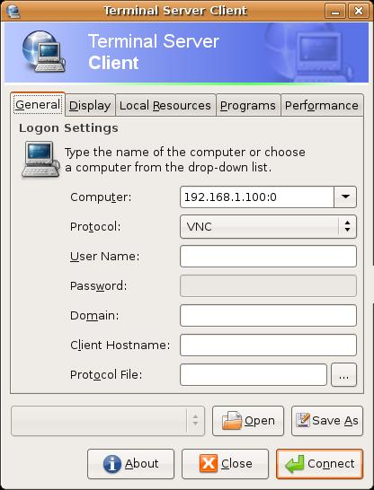 On the GNOME side of things, remote connections are done with the Terminal Server Client program (Figure 6). You'll find it under Applications in the Internet menu, but you also can run it directly with tsclient.