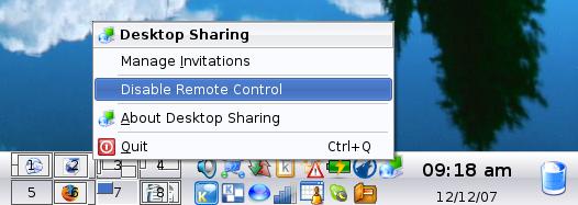 Figure 8. The KDE desktop sharing system tray icon (top right next to the clock) lets you manage connections and desktop control.