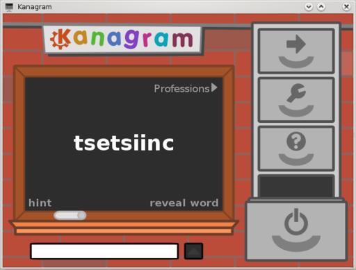 On the left-hand side of Kanagram's window, there's a large blackboard with the scrambled letters in the center. On the top right of the blackboard, the category is highlighted. You always can switch to another category with a click of the mouse. If you know the word, type it in the white input box below the blackboard. At any time, you can ask for a little help by clicking the word hint on the bottom left of the blackboard (Figure 2).
