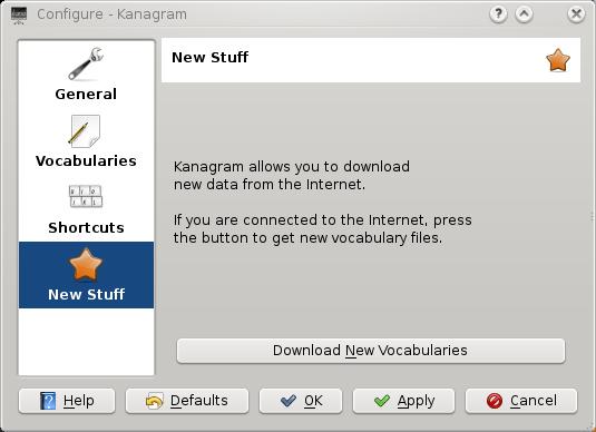 As I mentioned in the introduction to the game, Kanagram comes with a handful of vocabularies, but there are more available for download in a number of different languages. Simply click the second file drawer to open Kanagram's configuration dialog. You can look at existing vocabularies and create your own by clicking Vocabularies in the sidebar. To download new vocabularies, click New Stuff instead (Figure 3).