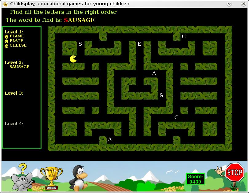 The plugin concept means that anyone can write games for Childsplay, but at the time of this writing, the package consists of 11 different games, a couple of which qualify as great nostalgia trips for the parents out there. For starters, there is a very simple game of Pong, slowed down enough to allow small players to move the paddles into position. You'll also find an educational version of the classic Pac-Man game. In this one, you help the yellow smiley character chase down the letters that make up words (Figure 4).