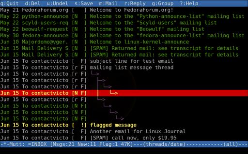 Now that you have access to your IMAP account and can send e-mail, here are some shortcuts for managing your Inbox. These shortcuts are the seductive draw of Mutt. You can zip through your e-mail quickly without ever touching a mouse.