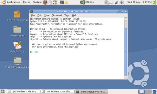 Luckily for us, the people at the SciPy Project have thought of this and have given us the program ipython. This also is available at the main SciPy site. ipython has been written to work with scipy, numpy and matplotlib in a very seamless way. To execute it with matplotlib support, type: