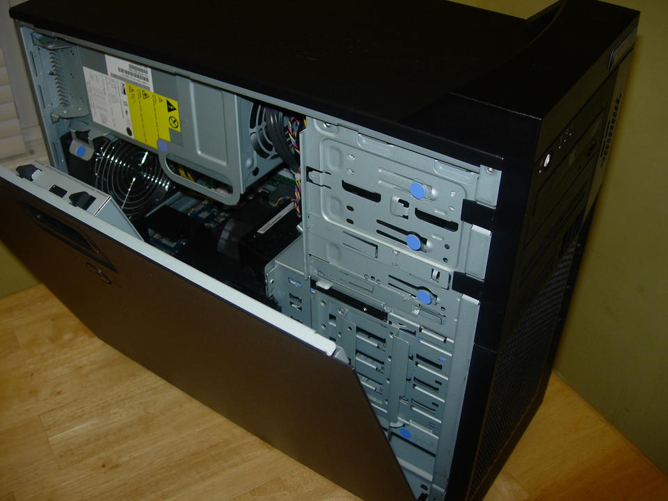 Accessing the box's internals is easy. The entire side of the case pops off at the press of a latch. The four SAS hard drive bays can be reached from behind a front panel that pops off just as easily as the side panel.