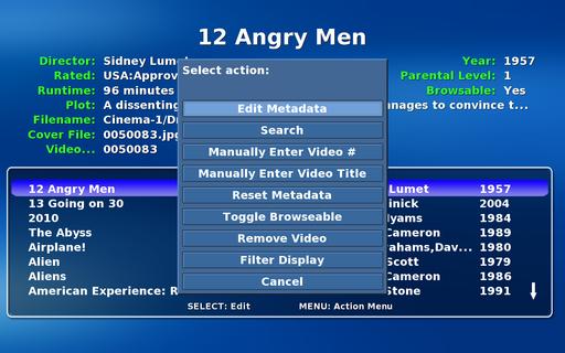 Page through the videos, if necessary, until you find the new entry. With the entry highlighted, press M for the menu, then select Search. If all goes well, MythVideo will find the video on the IMDb database and fill in the metadata for you.