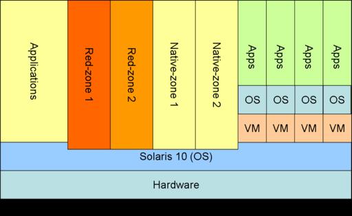 Solaris-Zones provides the ability to run Linux and Solaris on the same machine without all the overhead of full virtualization.