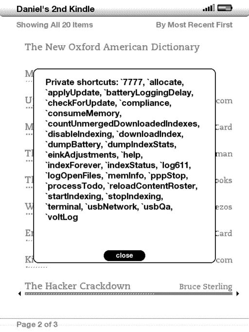 Another thing the Kindle 2 has that the original Kindle had is a debug mode. To get to the mode, bring up the search box and enter ;debugOn, and press the Enter key. Then, bring up the search box again, and enter `help to show the various debug commands that are available. There's no documentation for what the listed commands do. And, if you break your Kindle messing around with them, Amazon probably will consider you to have broken your warranty.