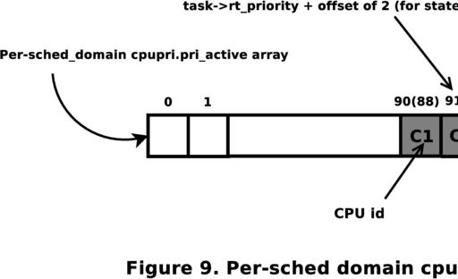 The pri_active bitmap tracks those priority levels that contain one or more CPUs. For example, if there is a CPU at priority 49, pri_active[49+2]=1 (real-time task priorities are mapped to 2–102 internally in order to account for priorities INVALID and IDLE), finding the first set bit of this array would yield the lowest priority that any of the CPUs in a given cpuset is in.