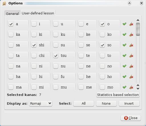 Check out the Statistics section too, because here you can keep track of your test scores over time and see your correctness ratio for each kana character.