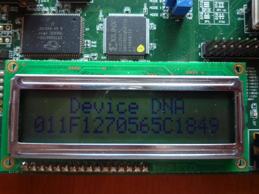 Spartan FPGAs have a unique ID number, called DNA. The DNA reader displays the intro string “DNA Reader by Ken Chapman”, and then this number is displayed on the LCD screen (Figure 5), working as shown in Figure 6. An Xilinx hardware macro called dna_port reads the DNA ID from the silicon. A PicoBlaze processor first displays the intro string, then gets the DNA ID from dna_port and finally sends it, one character at a time, to the LCD interface through the lcd_d data bus. The PicoBlaze code is stored into the dna_ctrl ROM.