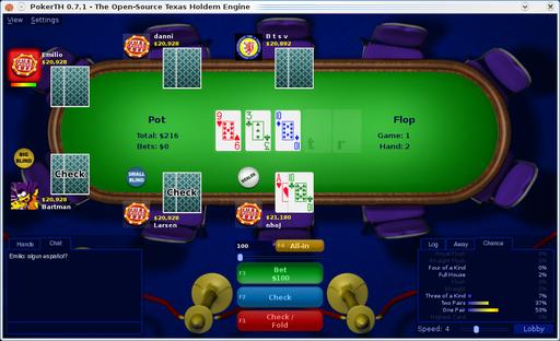 During this decade, Texas Hold'em rapidly has become one of the most popular variants of poker across the globe. Taking center stage in such films as Casino Royale and being the main feature in the World Series of Poker, Texas Hold'em is now the coolest game around. However, unless you want to use some kind of tacky on-line game, it's hard to find a sim that feels any good. Well, PokerTH steps up to the plate quite nicely indeed. According to its Web site: “PokerTH is a poker game written in C++/Qt4. You can play the popular Texas Hold'em poker variant against up to nine computer opponents or play network games with people all over the world. This poker engine is available for Linux, Windows and Mac OS.”