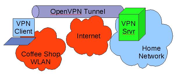 In this simple example, a laptop is connected to a wireless hotspot in a coffee shop (Coffee Shop WLAN), which in turn is connected to the Internet. The laptop has an OpenVPN established with a server on the home network; all traffic between the laptop and the home network is sent through the encrypted OpenVPN tunnel.