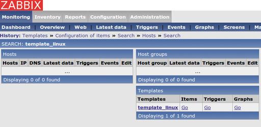 Let's look at the template we used with our first client. Using the Global search box at the upper right-hand side, search for “Template_Linux”. The search results should return a page that has links to the Items, Triggers or Graphs for this template (Figure 5). Select the Items link. All these Items will be monitored on any host that has the Template_Linux template applied to it, such as the first host configured above.