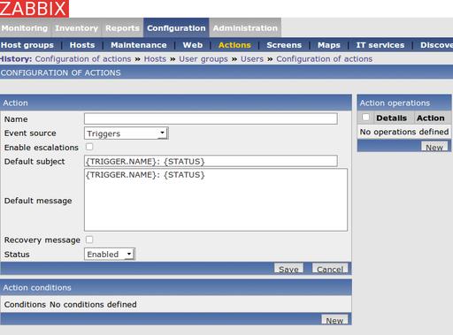 Actions occur when a trigger is activated. They can be via e-mail, Jabber, SMS message or running a remote script. Let's configure an action to e-mail the admin if any trigger with level Disaster has been activated. Select Configuration→Actions, and then the Create Action button on the right-hand side of the screen. The Configuration of Actions screen should be visible (Figure 9). Name it something helpful, then click the New button under Action conditions. Choose Trigger severity from the New Condition area, and change the severity level from Information to Disaster. Click Add when finished. Next, select the New button in the Action operations area. Configure the operation to send a message to a single user named admin (Figure 10). Click Add when done. Finally, click the Save button. Now, any trigger that you assign the severity level of Disaster will result in an e-mail being sent to the Admin user. You can create Actions for a single trigger from a specific host if needed, but the action above can be treated like a “site-wide” action.