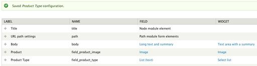 Completion of the above will take you back to the table of fields for Product. Now, let's add another field to indicate whether an item is a pen or a pencil. Call it “Product Type”, and set the Field Type to “List (text)”, leaving the Widget set to Select List, so that when content is entered later, you can select the product type from a list. This time after you save, you'll see a form containing a field called, “Allowed values list”. Enter in that field, on separate lines, “1|Pen” and “2|Pencil” (without the quotation marks). This is a key and value hash that will become the available choices for users. Now save your way out, accepting default settings. The field list should then look like the screenshot shown in Figure 2.