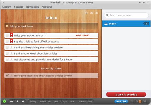 During the past few years, I've written about task-management systems, “get things done” digital tools and ways to keep track of to-do lists in Linux. This month, I'm sharing Wunderlist, which is a cross-platform task-management and sharing utility that is truly amazing. When I say cross-platform, I really mean it too. Wunderlist works in Windows, OS X, Linux, iOS, Android, Blackberry, the Web and probably another half-dozen interfaces I've yet to encounter.