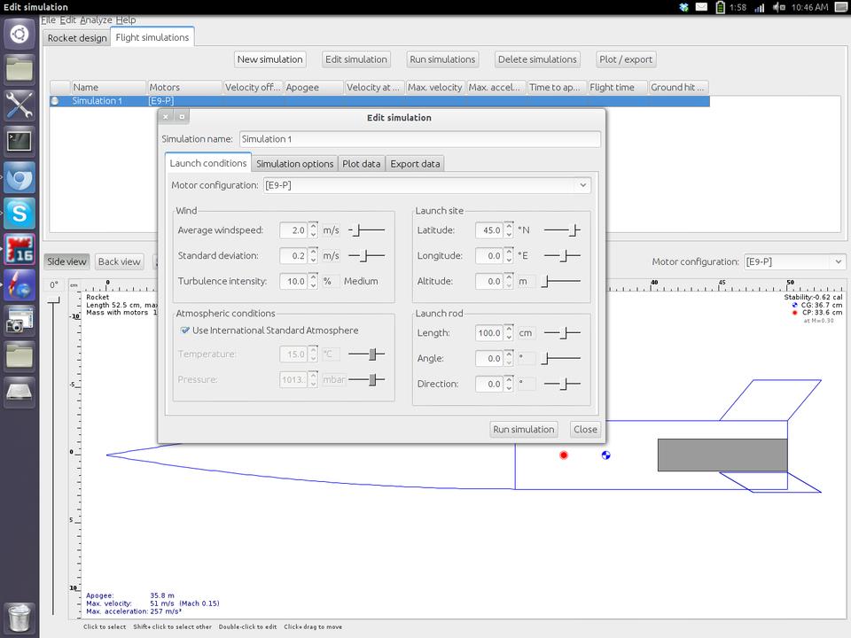 Once you have a final design, you can run it through simulations. The simulator can apply different conditions on your rocket, like applying crosswinds or taking Coriolis effects into account, and it shows how your model rocket should behave. OpenRocket uses JFreeChart to plot your rocket's behavior based on the simulation results.
