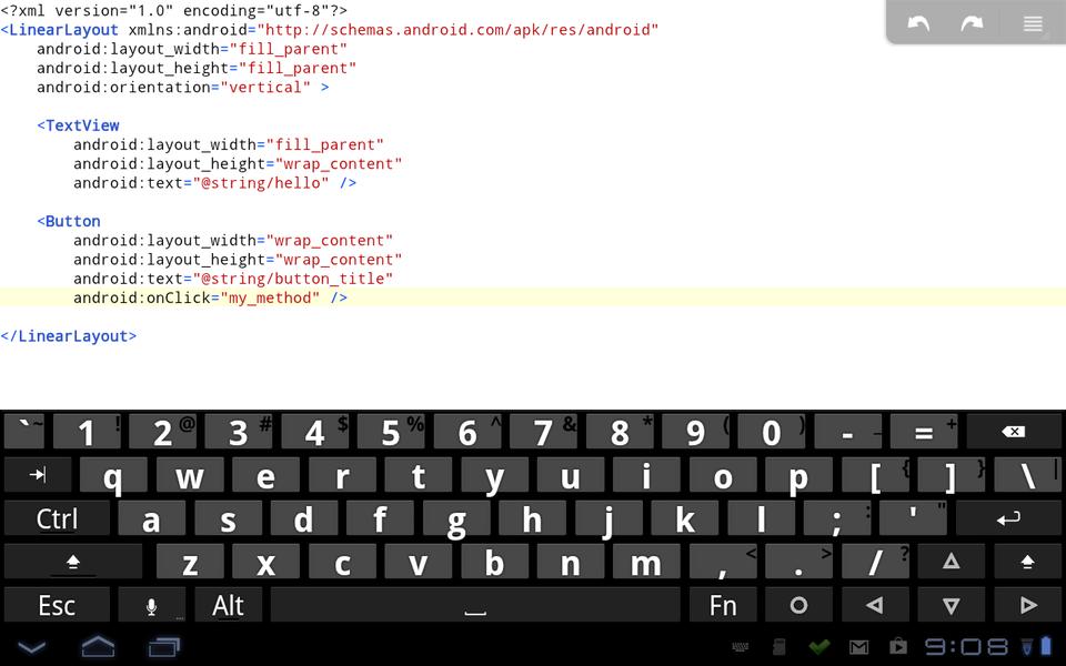 To this example, let's add a button to change the text being displayed. If you need to do any amount of typing, you will want to download and install a more complete soft keyboard or use an external Bluetooth keyboard. A good soft keyboard is the hacker's keyboard. It includes a lot of extra keys that are useful in code editing, including arrow keys to aid navigation and real control, Tab and Escape keys. Most soft keyboards included on Android devices lack these.