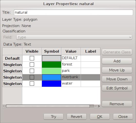 You can edit the way a layer is displayed either by double-clicking the layer within the list in the legend pane or by right-clicking the layer of interest and selecting Properties. This will pop up a new window (Figure 4). In this case, I selected the “type” field within the classification pane. The easiest choice at this point is to click the Generate Class button. The Generate Classification window will pop up, where you can click on the Retrieve From Table button to get a list of the possible values. I accepted the default gray-scale mapping for the colors, giving four new entries in the layer properties. But this is not very interesting either, yet. Selecting each of the new properties, you can edit the symbol and change the colors for each of the types (Figure 5). If you want to have a preview of what this will look like, you can click the Try button. If it doesn't quite look right, you always can click the Revert button to undo the changes and try something else.