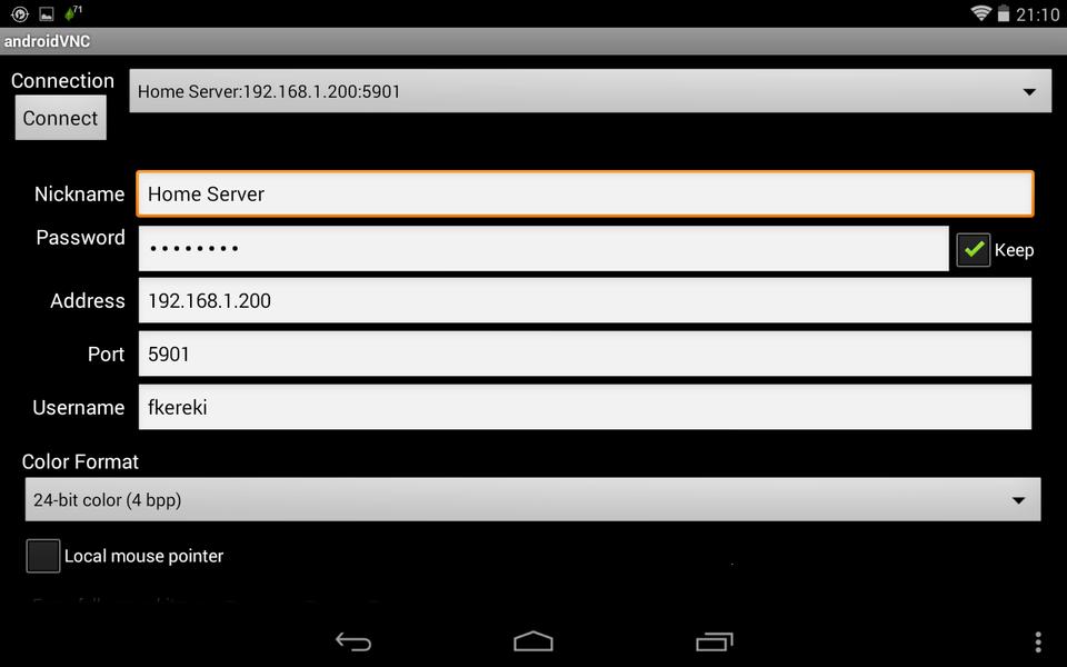 On opening android-vnc-viewer, you can choose an earlier defined connection or create a new one. Speed for such connections usually isn't great, so you may want to investigate different color formats—24 bits of color depth look good, but fewer colors mean higher speed. When a connection is established, you can work remotely as with a browser. Your finger is the mouse, a single tap is a left-click, and a double tap is a right-click. (For other needs, try Menu→Send Keys.) Long-tapping the screen provides buttons for enlarging or reducing the display, as well as a virtual keyboard. This app can be a bit harder to configure, because you'll probably have to open ports and so on in order to access an internal machine over the Web. If this is a problem, check out the second option.