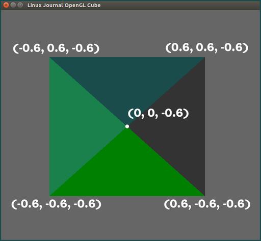 As an exercise, the front face of the cube is made using four triangles. Figure 5 shows the coordinates of the front face of the cube when four triangles are used to define it. The point (0,0,-0.6) has been chosen arbitrarily. You just need a point that belongs to the front face of the cube.