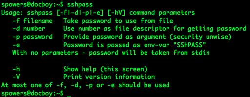 So, sshpass—it's a simple tool, but in a pinch, it can be incredibly helpful. You use it with the user name and password as command-line arguments (with some variations, see the help screen in the screenshot), and it injects them into your ssh (or scp) command.