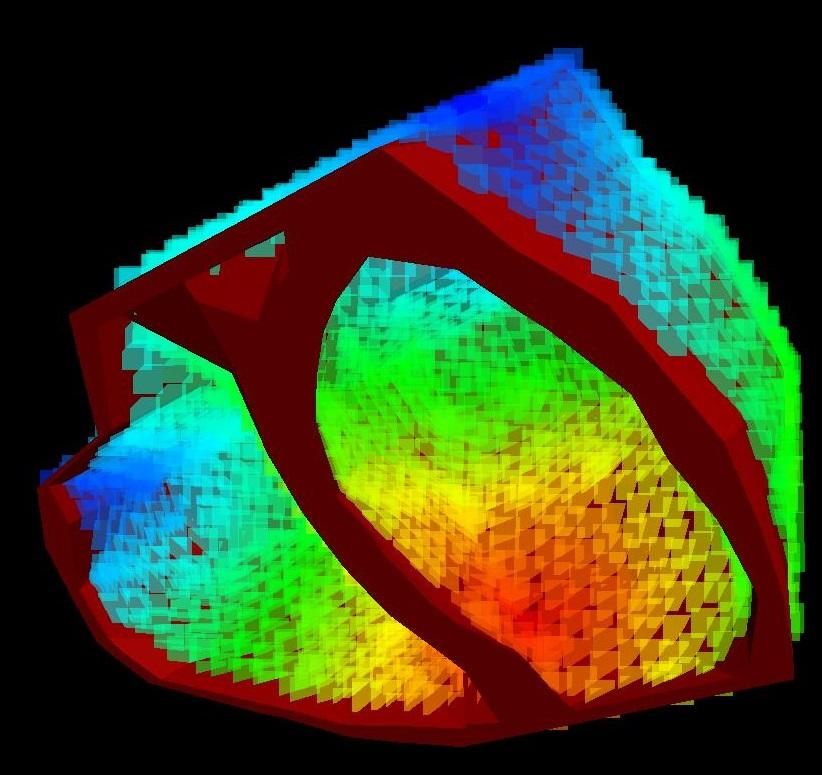 On their way to the body surface, the electrical signals undergo the influence of the organs they meet. Until recently, it was hard to visualize this influence, but with the availability of more and more computing power on the desktop, it is possible to generate a 3D map that exactly shows how the lungs, the spine and the chest bone bend the electrical currents. To trace the signal path, we overlay a 3D grid on the heart, using the splendid GMSH open-source package that has been under development for many years.