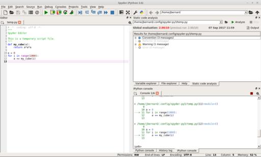 Several tools are available for working on code and algorithm quality. You'll probably want to start with a static code analysis. Run it by clicking the “Source→Run static code analysis” menu item or by pressing F8. This will run the analysis and will provide the results in a new pane that will pop up in the top right-hand pane.