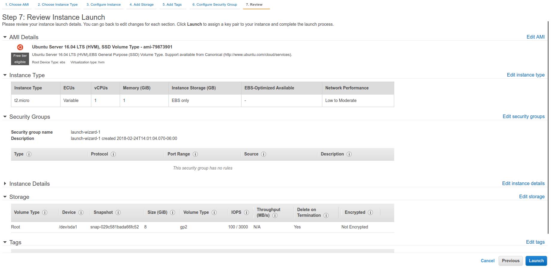 From this point, you can decide whether to customize this particular instance further with additional local storage (using the Elastic Block Storage or EBS framework), security policies, deployment region (data center) and so on. For this example, let's select "Review and Launch".